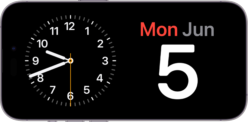 StandBy. Turn your iPhone on its side while charging to glance at important information from a distance. You can turn your iPhone into a bedside clock, view photos, control music, and more. See Use StandBy to view information at a distance while iPhone is charging.
